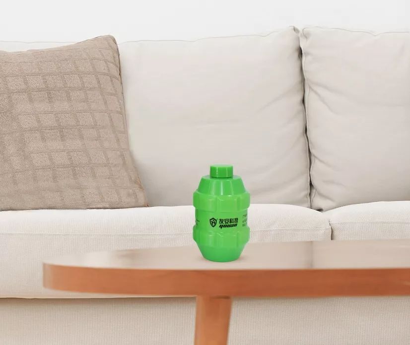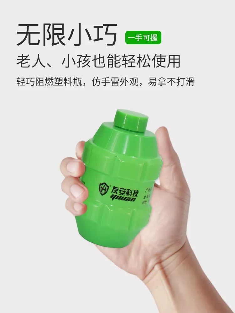 瓶體采用輕巧的阻燃材料,總體重量在0.4KG左右,無論老人小孩都能輕松拿起并投出。外觀仿“手雷”設(shè)計(jì),瓶身凹凸不平,易拿不打滑;瓶體韌性好,耐擠壓,一手捏不破,受到外部撞擊才破裂,安全有效。