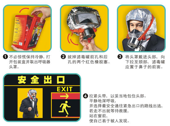 消防科普教育基地、學(xué)校里的安全教室也一定要配幾個(gè)已拆封的防煙面具讓人們用來練習(xí)。并告訴人們,如果你外出住旅館,旅館里配備了防煙面具。那么一旦發(fā)生火災(zāi),逃生時(shí)你應(yīng)該使用。