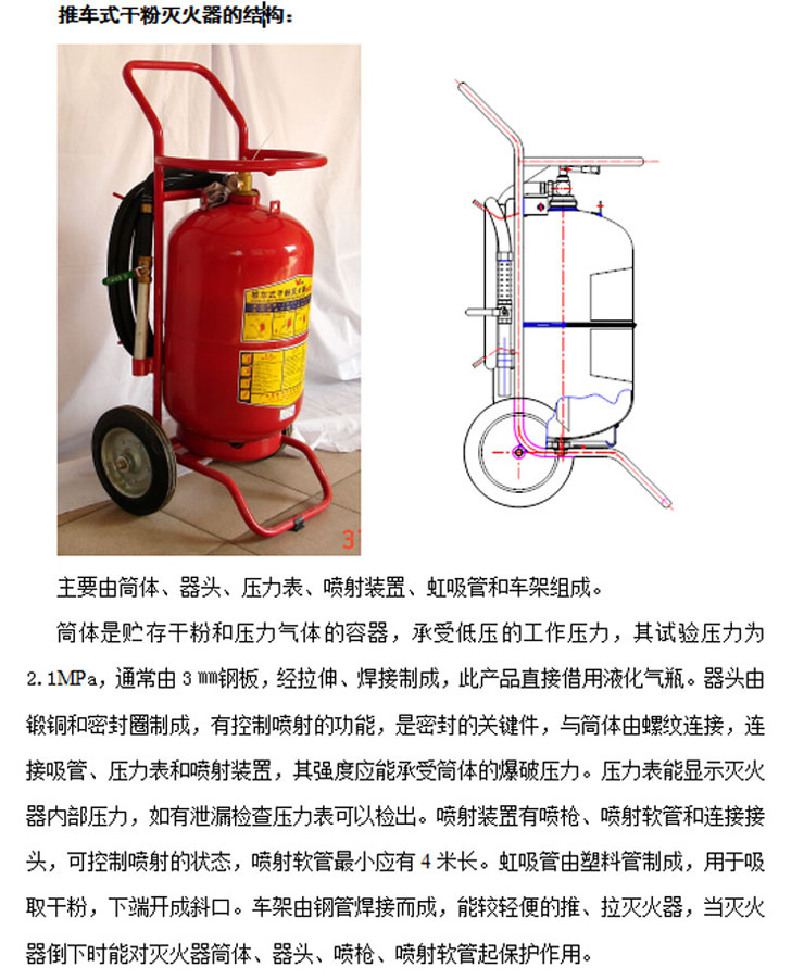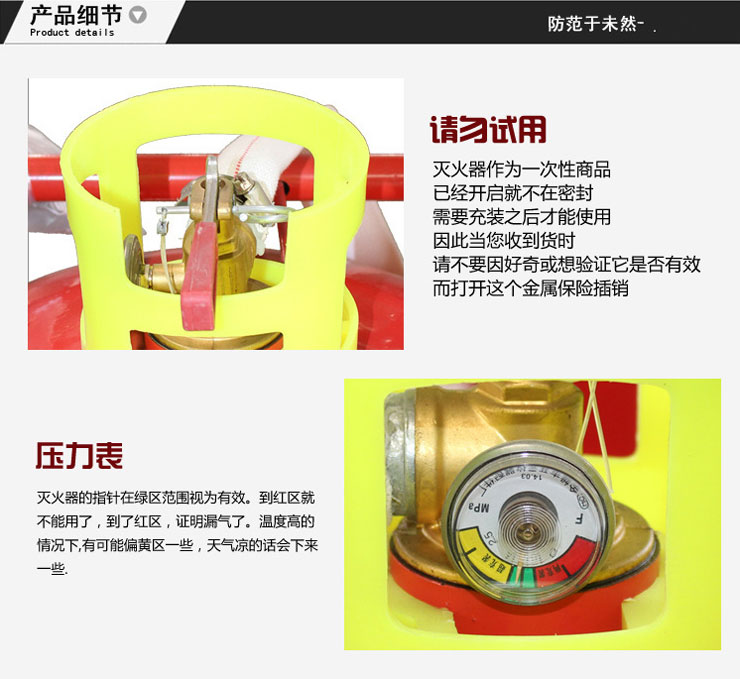 3、滅火器瓶頭閥裝有壓力表,具有顯示其內(nèi)部壓力的作用,便于檢查維修。