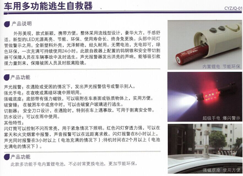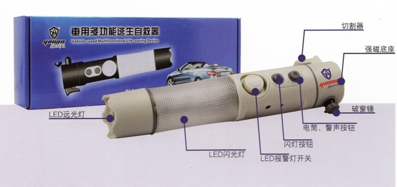 產品說明:外形美觀,款式新穎,攜帶方便。整體采用流線型設計,豪華大方,手感舒適。新型的LED光源高亮、節(jié)能、環(huán)保、使用壽命長、終身免更換。頭部中間燈管做警示之用。全新塑料外殼,光澤鮮艷,經久耐用。無需電池,充電即可,綠色環(huán)保,一次充滿可持續(xù)使用24小時。此款自救器上配置的鎢鋼錐和安全帶切割器可保障人員在車輛事故中及時逃生,場地光報警器發(fā)出洪亮的聲響,能夠吸引救援力量到來,保障被困人員及時脫離險境。