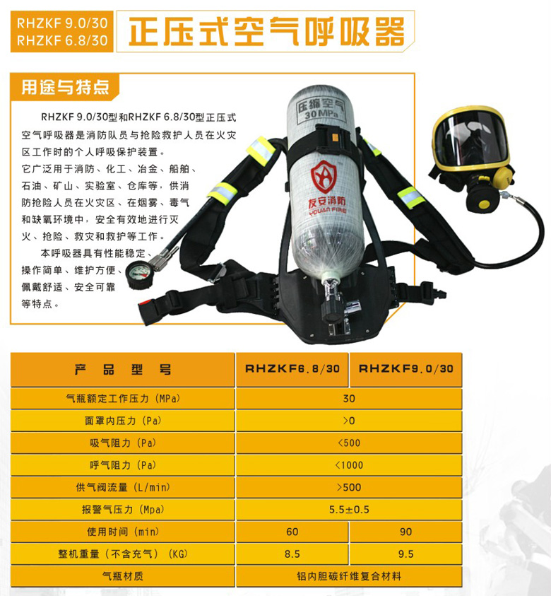 壓式空氣呼吸器 是一種自給開(kāi)放式空氣呼吸器,又稱(chēng):空氣呼吸器,消防空氣呼吸器,搶險(xiǎn)消防呼吸器等呼吸器。主要適用于消防、化 工、船舶、石油、冶煉、廠礦等處,使消防員或搶險(xiǎn)救護(hù)人員能夠在充滿(mǎn)濃煙、毒氣、蒸汽或缺氧的惡劣環(huán)境下安全地進(jìn)行滅火、搶險(xiǎn)救災(zāi)和救護(hù)工作。